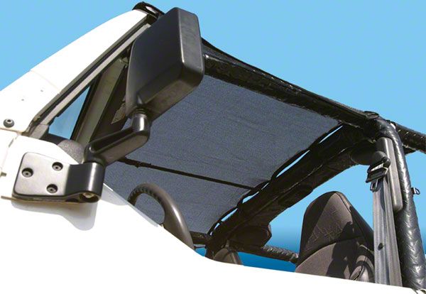 Construction and Appearance. Crafted from a high-tech mesh material, the KoolBreez Sun Screen Brief Top is designed for durability and functionality. Its sleek black color complements the vehicle's look while providing efficient sun protection.