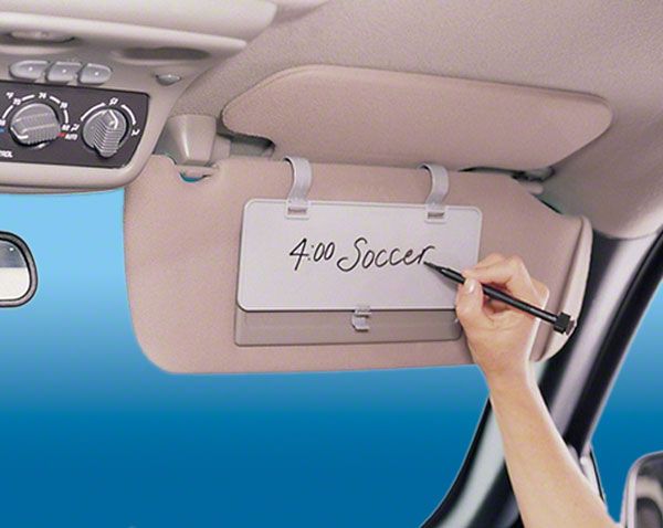 Handy Dandy. A handy, erasable note board that attaches to your visor. Ideal for phone numbers and reminders. The acrylic writing board is clear and goes with any color scheme. All cars are compatible with adjustable clips. Flips up to reveal the vanity mirror.