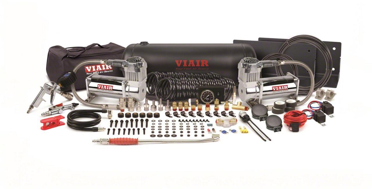 Complete Air System Kit. Made for a universal fit, this Viair Mission Critical High Flow OnBoard Air System comes in a mix of matte black and polished chrome finishes. Built as a pre-packaged compressed air kit, this is able to output 150 PSI / 4.55 CFM. This kit includes 2 33% duty cycle 400 C compressors, a 2 gallon air tank, a 180 PSI digital tire inflation gun, and all the required parts and requirements of a fully functional air system.
