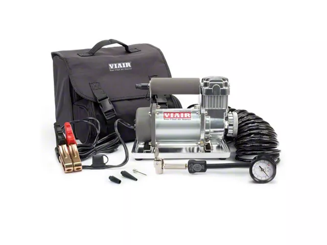 Portable and Organized. Furthermore, this Viair 300P Portable Air Compressor contains a 25-foot air hose, an aluminum tray base with vibration-reducing isolators, and a premium tote bag to keep everything organized. For off-road or on-road vehicles, motorbikes, and other air requirements, VIAIR 300P portable air compressors are perfect.