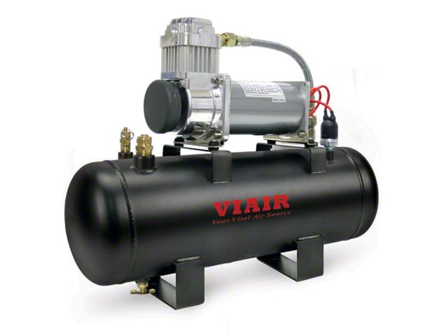 Description. Fast-Fill 200 PSI Air Source Kits come with a powerful, low amp-draw 380C VIAIR compressor mounted on a 200 PSI-rated 2.0 gallon air tank with 5 ports. All 200 PSI Air Source kits come with a pre-wired 165/200 PSI pressure switch. Both kits not only come with the industry’s leading 200 PSI compressors but also come with a drain cock, safety valve, 1/2-inch port compression fitting for 3/8″ (I.D.) air line pre-installed! To use, simply connect the pressure switch to fused power, make a solid ground, and connect an air line to the compression fitting. A 40-amp relay and an appropriately-rated fuse is recommended for use with this unit.