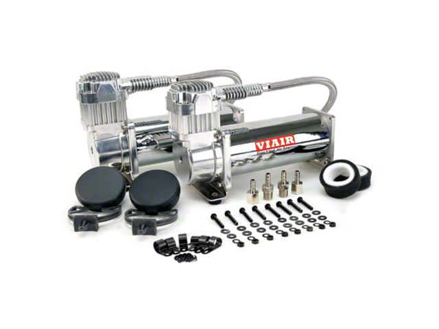 Description. VIAIR’s 444C Dual Performance Value Pack air compressors feature a newly-developed head assembly, with a patent pending intercooler head, and is capable of a maximum 200 PSI with a 100% duty cycle to power an air suspension system or any other application you may have. The 444C Dual Performance Value Pack includes two 12-volt Chrome or Stealth Black VIAIR 444C air compressors, which are also equipped with a stainless steel braided leader hose with an inline check valve.