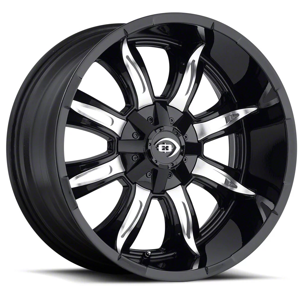 Vision Off-Road Manic Gloss Black Machined Wheel; 18x9. The Vision Off-Road Manic Gloss Black Machined Wheel offers a striking balance of style and refinement. Its unique design accentuates the vehicle's aesthetic, while the premium construction underscores its robust nature. This wheel is a perfect choice for those seeking both elegance and a strong visual statement.