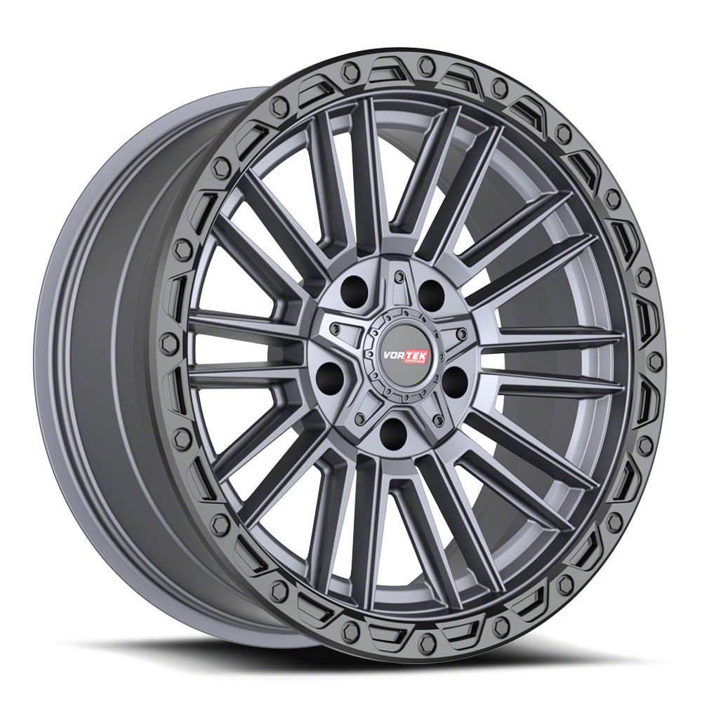 Vortek Off-Road VRT-604 Matte Titanium with Black Bead Ring Wheel; 17x9; -12mm Offset is a visually striking choice, offering a combination of rugged durability and modern styling. Its design complements off-road and sporty vehicles alike, enhancing the overall aesthetic appeal.