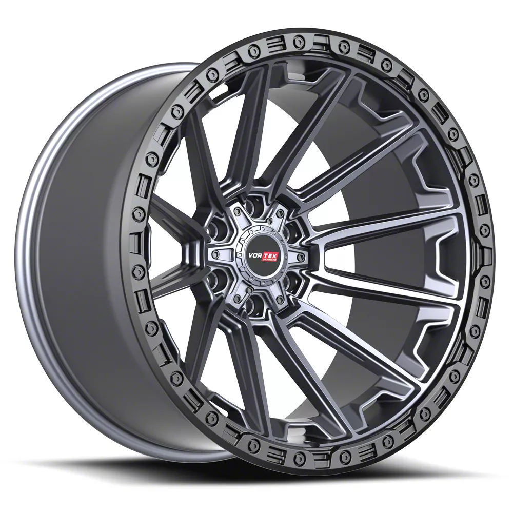 Vortek Off-Road VRT-601 Matte Titanium with Black Bead Ring 6-Lug Wheel; 18x9; 12mm Offset is a visually striking choice, offering a combination of rugged durability and modern styling. Its design complements off-road and sporty vehicles alike, enhancing the overall aesthetic appeal.