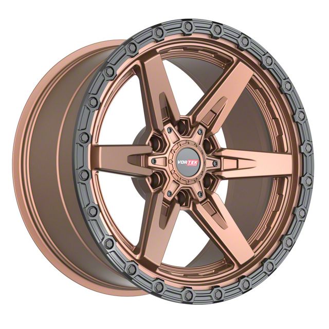 Vortek Off-Road VRT-602 Matte Bronze with Black Bead Ring 6-Lug Wheel; 20x9; 12mm Offset is a visually striking choice, offering a combination of rugged durability and modern styling. Its design complements off-road and sporty vehicles alike, enhancing the overall aesthetic appeal.
