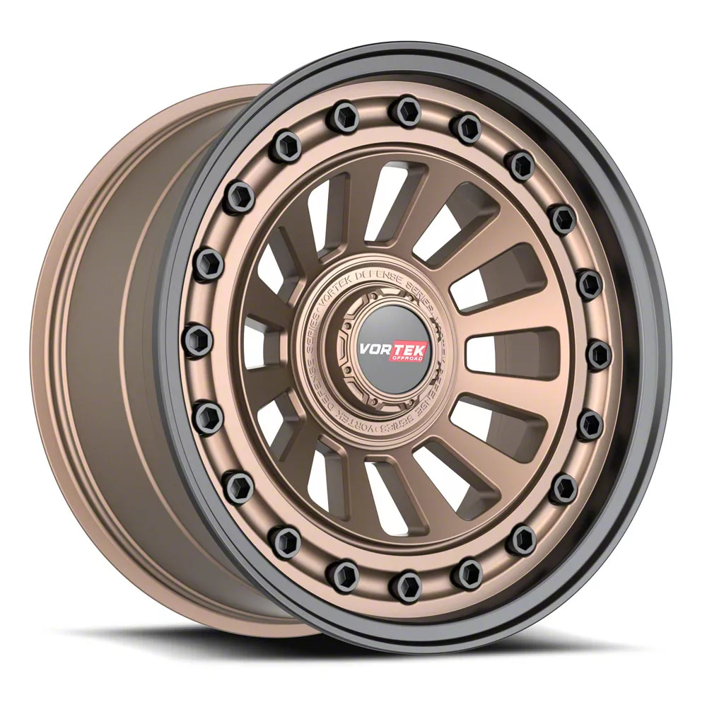 This 20x9.5 Vortek Off-Road VRD-702 Matte Bronze with Black Bolts and Lip 6-Lug Wheel; 20x9.5; 0mm Offset is completed in a high-quality matte bronze finish with black accents to make your wheel the envy of everyone. For added looks and durability, the wheels has a durable clear coat that withstand the rigors of daily driving.