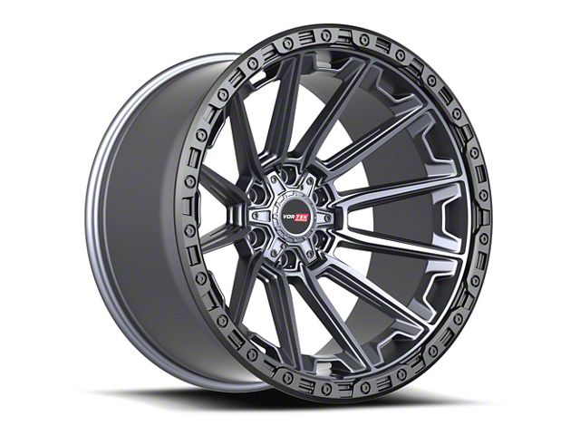 Vortek Off-Road VRT-601 Matte Titanium with Black Bead Ring 6-Lug Wheel; 18x9; -12mm Offset is a visually striking choice, offering a combination of rugged durability and modern styling. Its design complements off-road and sporty vehicles alike, enhancing the overall aesthetic appeal.
