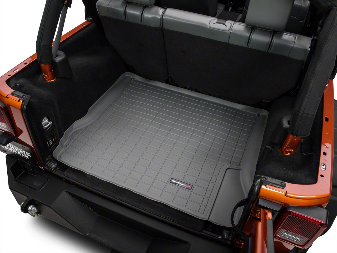 Design. Cover the cargo floor area of your Jeep Wrangler with the WeatherTech Cargo Liner in gray to protect against dust, dirt or stains. It is computer cut to ensure the perfect fit. This cargo liner has treaded surface top that keeps the cargo in place and prevent the items from sliding or skidding during travel. It is designed with a high outer rim that helps contain liquid spills, dust or dirt to keep the carpeted cargo floor area clean.