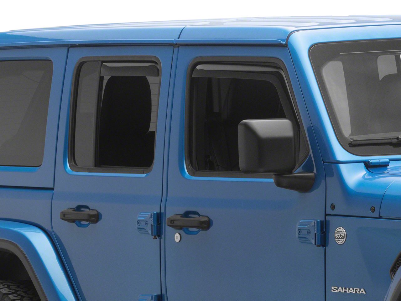Application. These Weathertech Side Window Deflectors fit 2018 to 2026 Jeep Wrangler JL 4-Door models.