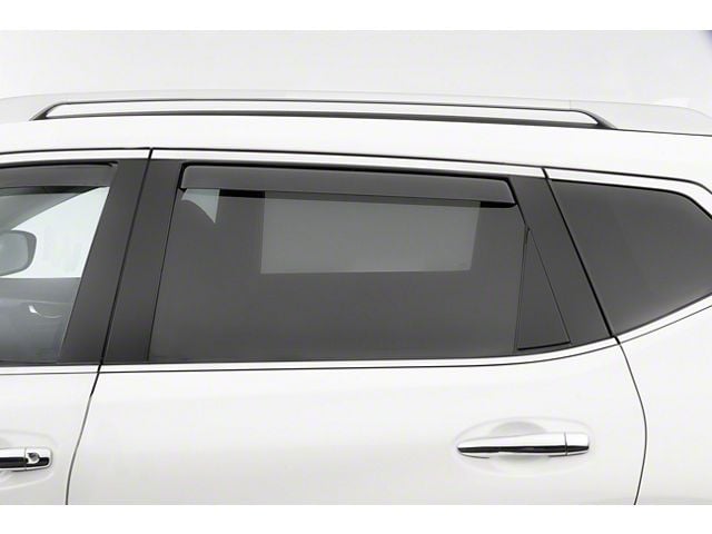Better Fresh Air and Interior Protection. The WeatherTech Side Window Deflectors; Rear; Dark Smoke are precision-engineered accessories designed to enhance your driving experience by allowing fresh air circulation while keeping adverse weather elements out. Specifically designed for the rear windows, these deflectors integrate seamlessly with your vehicle's contours. Their dark smoke tint not only adds a sleek, custom aesthetic but also offers additional sun glare reduction, making them a functional and stylish upgrade for any vehicle.