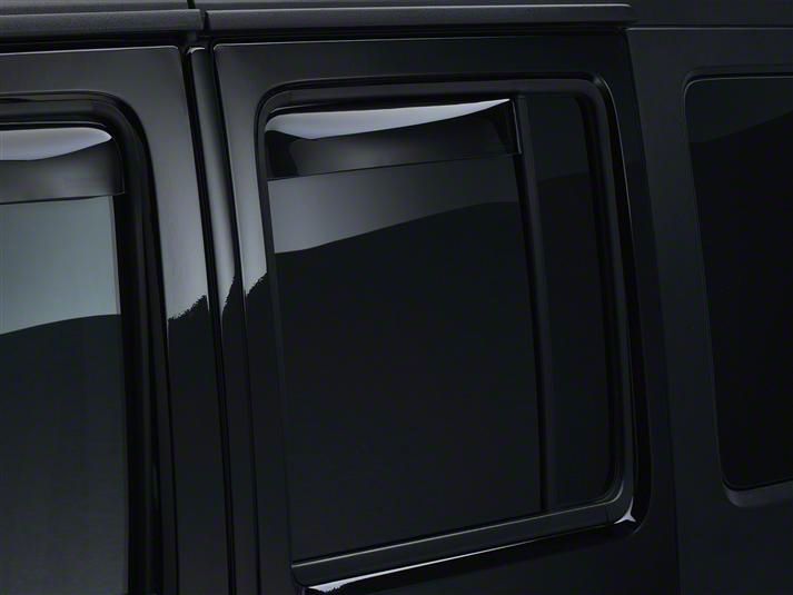 Increase Your Wrangler JK Four Doors Window Options. The Weathertech Dark Smoke Rear Side Window Deflectors provide shielding from the vehicle slipstream when travelling with the rear windows down, as well as keeping rain out. The units are a sleek, low-profile upgrade for any Wrangler JK Four Door that also double as sun protectors on hot days when parked, to limit the build-up of unwanted heat in the cabin while allowing interior heat to dissipate.