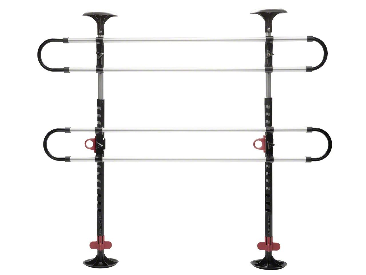 Whether you drive a car, SUV or minivan, the engineers of WeatherTech developed a Pet Barrier using strong yet lightweight polymers and alloys to reduce weight, improve ease of installation and removal, while offering security for your pet and peace of mind for your travels. Easy to Install Installs in minutes – Typical installation requires no tools or drilling. Locks using easy to turn red knobs along with 14 speedy adjustments. Adjusts to a minimum height of 30" with a max of 46". Adjust to a minimum width of 39" with a max of 66". Large round flexible support feet create a snug fit which eliminates rattle. Support feet work great even on heavy contoured headliners. Built to Last 100% designed, engineered and manufactured in the USA. Manufactured with strong yet lightweight aluminum. Side adjusting slides made from a strong advanced plastic material. Main upright 1" diameter bar is injection molded out of a proprietary black resin that is incredibly strong. Internal upright is a 3/4" diameter aluminum extrusion with a bright satin anodized finish. Center aluminum cross bars are 5/8" in diameter with a bright satin anodized finish. The 1/2" diameter side adjusting slides are custom designed and made from proprietary resin that is very strong. Spacing between the cross bars is 3-3/8". Essential for Drivers Keeps your focus on the road; not on your furry friend. Limits distractions; not your visibility. Protects the vehicle’s upholstery from hair, claw scratches and muddy paws. Excellent for Pets Keeps pets comfortable, safe, and secure. Helps prevent pets from leaping over seats.