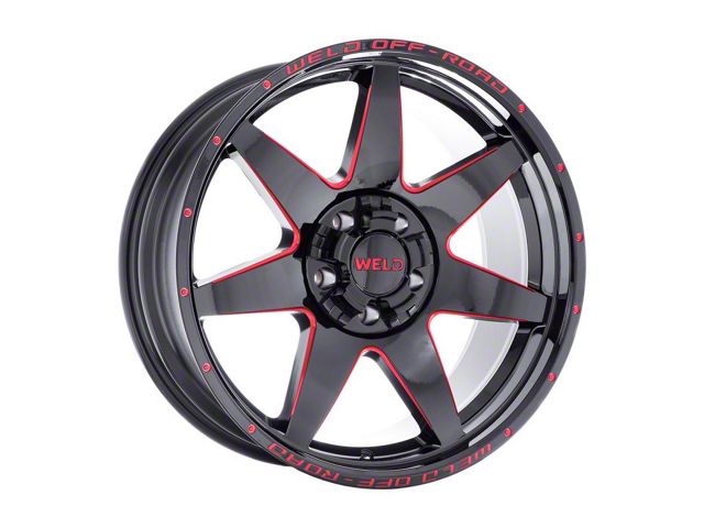 Weld Off-Road Retaliate Gloss Black Milled with Red Accent 6-Lug Wheel; 20x10; 13mm Offset exudes sophistication with its finish, offering a sleek and modern appeal to any vehicle it adorns. The design is meticulously crafted to enhance the aesthetic of your vehicle, giving it a distinctive and upscale look. Perfect for those seeking to elevate their vehicle's style, this wheel blends seamlessly with both contemporary and classic vehicle designs, making it a versatile choice for a wide range of vehicles. Its robust construction ensures durability, making it a reliable choice for drivers who value both style and quality.