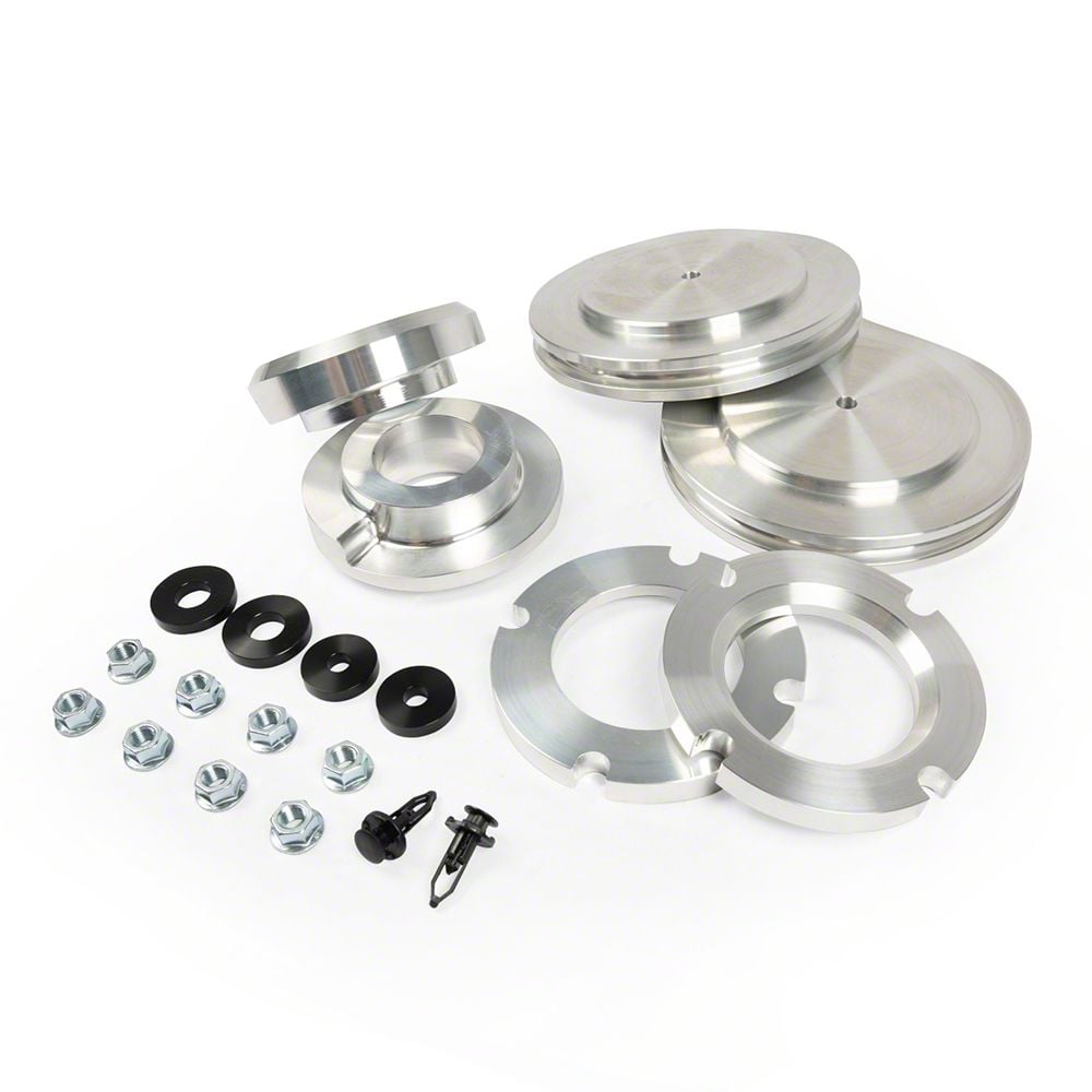 Construction And Appearance. Each component is CNC‑machined from billet aluminum—collars, top shim plates, and rear lift pucks—and left in a raw, natural aluminum finish. Precision machining ensures tight tolerances and durability, while the raw finish complements industrial or polished builds.