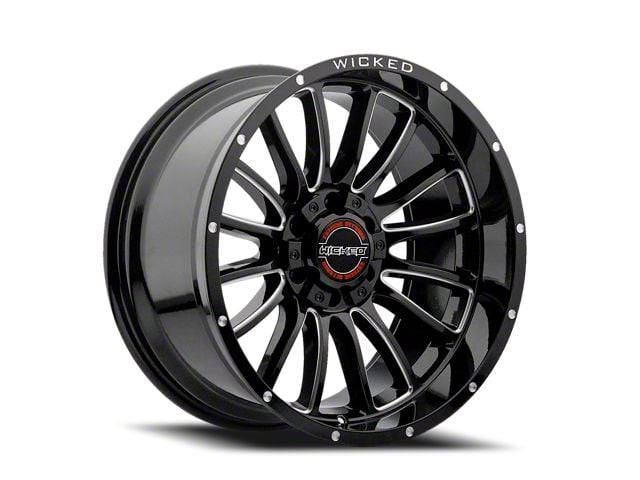 This 20x10 Wicked Offroad W908-B Gloss Black Milled 6-Lug Wheel; 20x10; -19mm Offset is completed in a high-quality gloss black finish with steel milled accents that will be the envy of everyone. For added protection and looks, there is a clear coat designed to handle whatever the road, or beyond, throws at it.