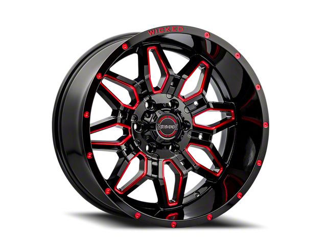 Wicked Offroad W909B Gloss Black Milled with Red Tint 6-Lug Wheel; 20x10; -24mm Offset delivers a bold and modern aesthetic, ideal for enthusiasts seeking a refined yet assertive look for their vehicle. With its standout design and distinct finish, this wheel enhances the vehicle's visual stance and street presence. The precise craftsmanship and premium aluminum build reflect Wicked Offroad's dedication to quality and distinctive design. Whether parked or in motion, this wheel draws attention with its clean, aggressive styling.