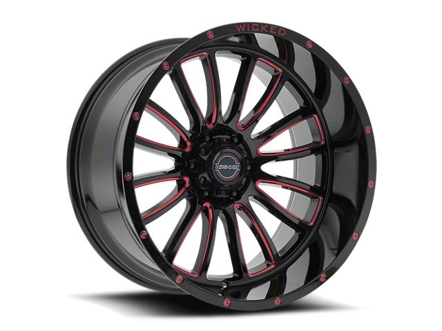 Gloss Black Milled Finish with Red Tint. This Wicked Extreme Off-road Wheel has a high quality, black finish that features milled accents for an impressive appearance. For added protection and good looks, this Wheel is completed in a durable, gloss, red tinted clear coat that is tough enough to stand up against the hazards of everyday driving - including road chips and pitting.