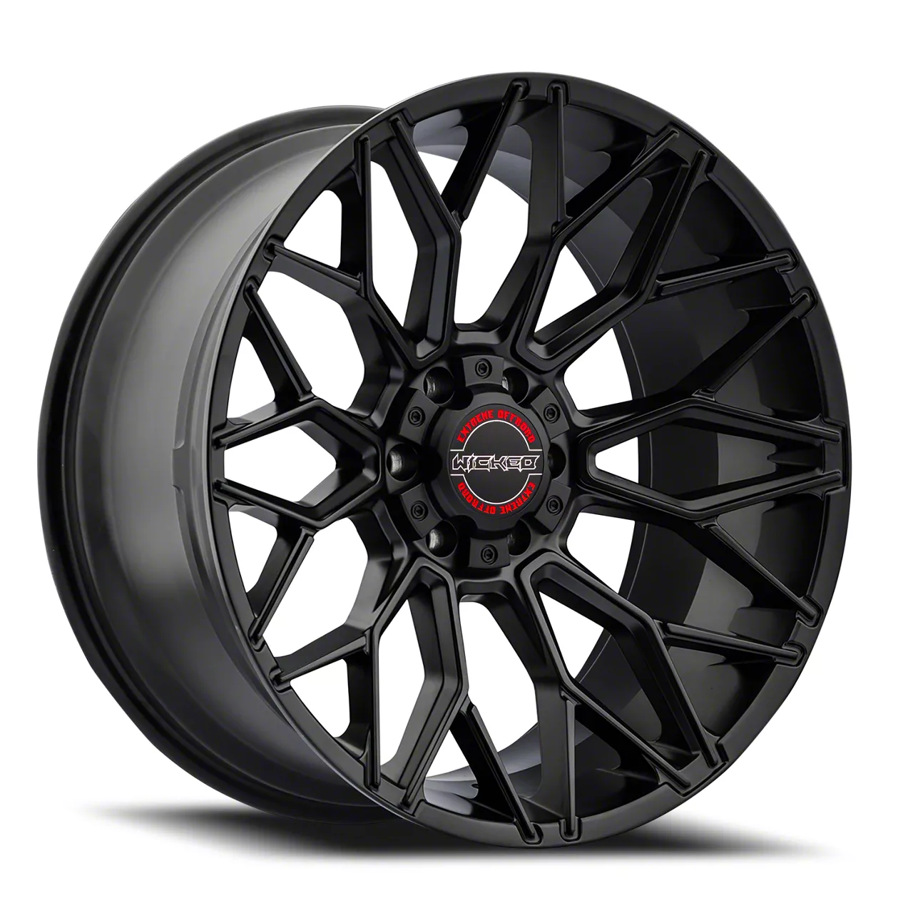 Wicked Offroad W934 Satin Black 6-Lug Wheel; 22x10; -19mm Offset. The Wicked Offroad W934 Satin Black 6-Lug Wheel offers a striking balance of style and refinement. Its unique design accentuates the vehicle's aesthetic, while the premium construction underscores its robust nature. This wheel is a perfect choice for those seeking both elegance and a strong visual statement.