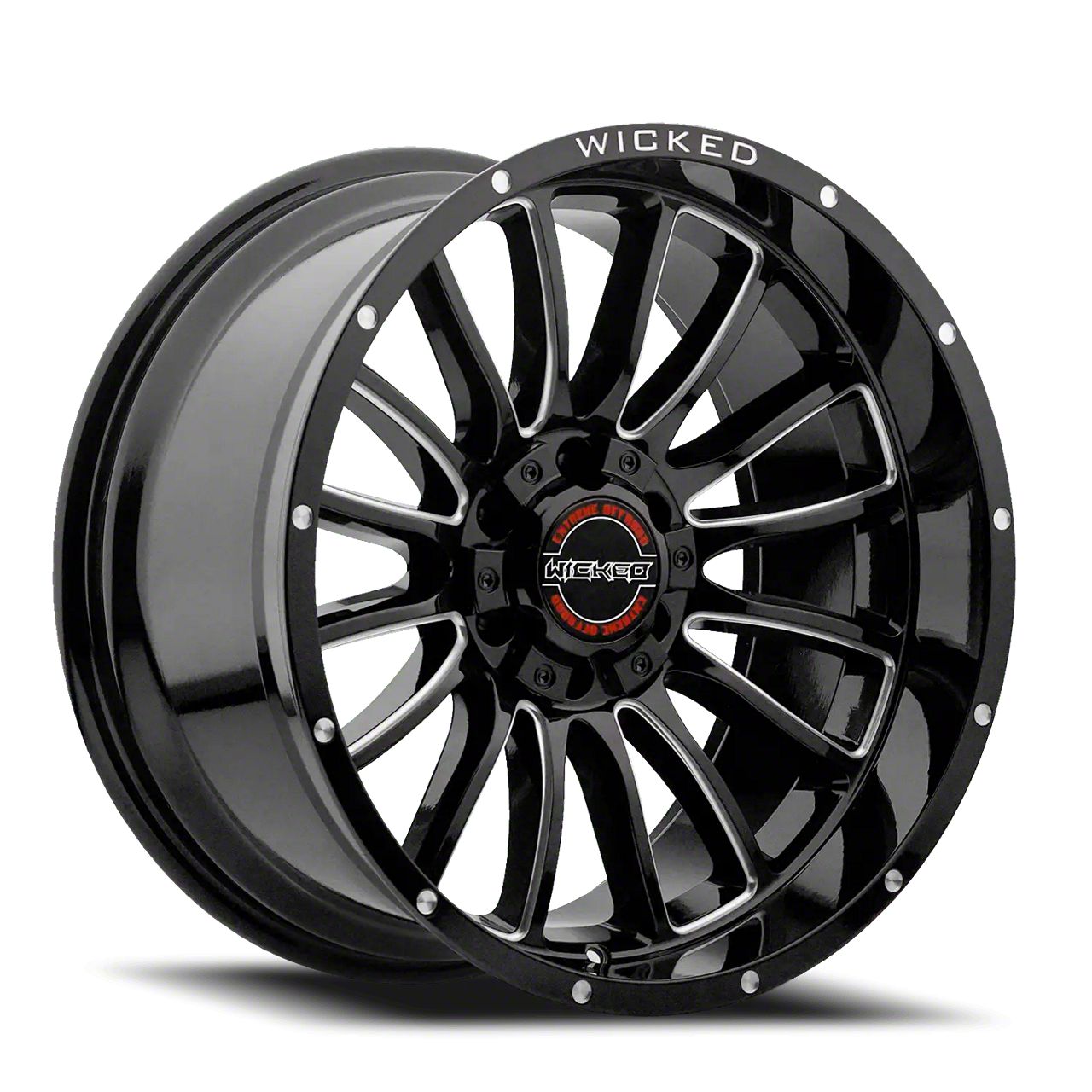 The 20x10 Wicked Offroad W908 Gloss Black Milled Wheel is given a gloss black finish to keep your wheel looking as sharp as its design. This wheel’s milled steel accents are where it really shines through, and quite literally.