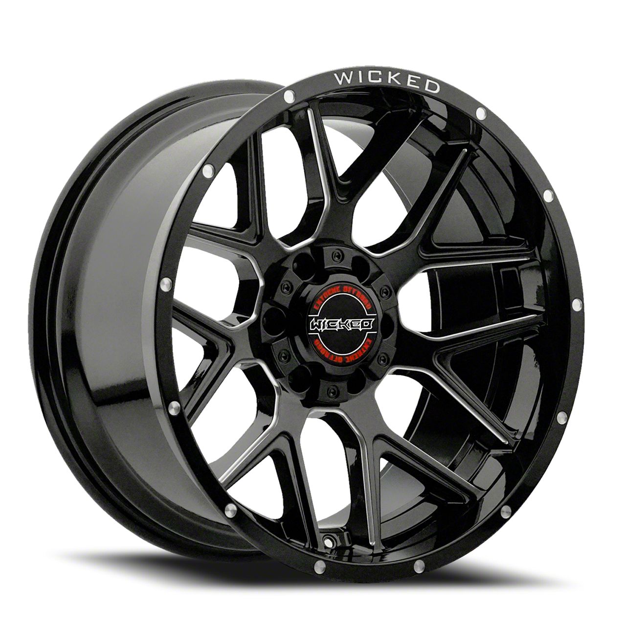 This 20x10 Wicked Offroad W903-B Gloss Black Milled 6-Lug Wheel is completed in a high-quality gloss black finish with steel milled accents that will create a striking appearance. There's a durable clear coat that protects against driving hazards.