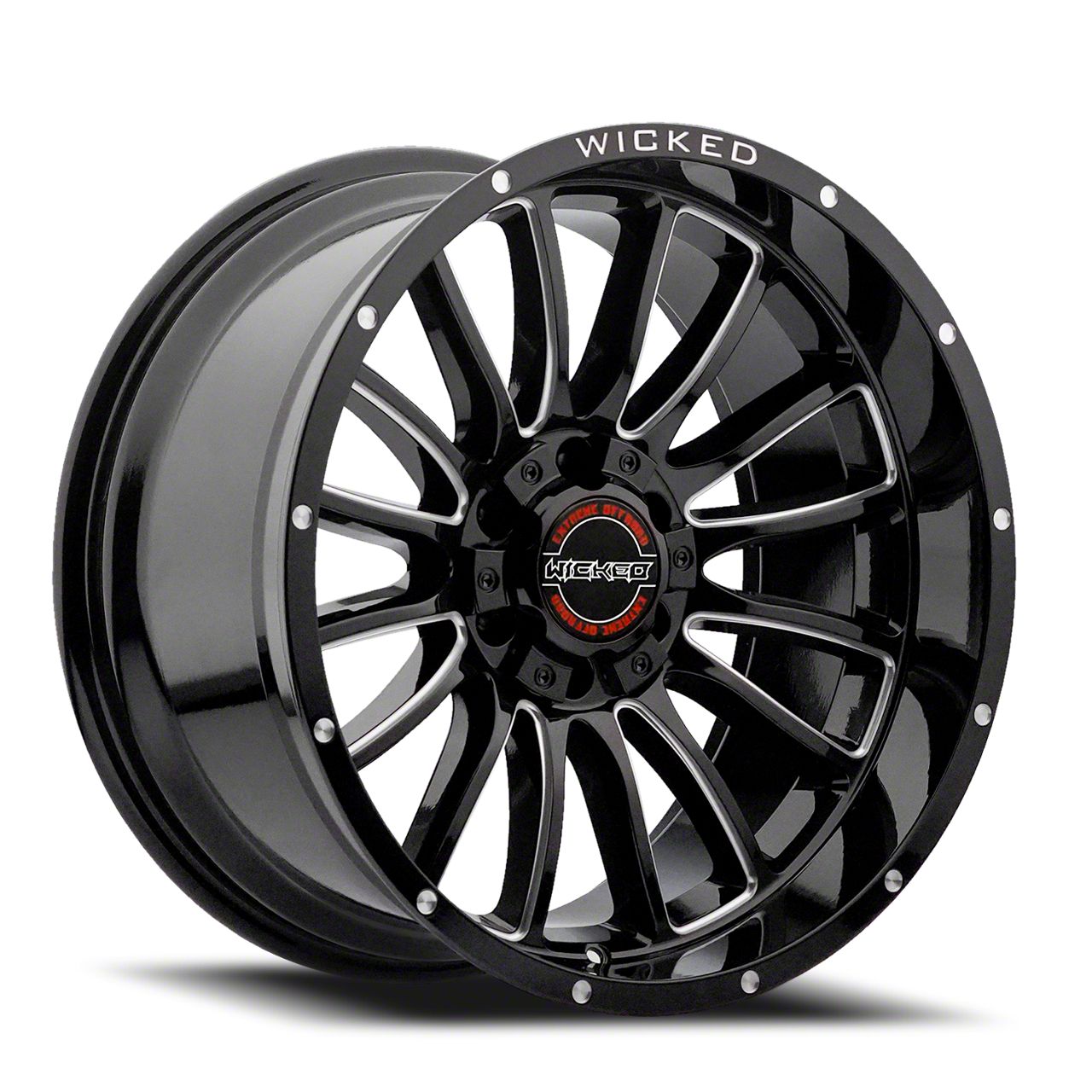 This 20x10 Wicked Offroad W908-B Gloss Black Milled 6-Lug Wheel is completed in a high-quality gloss black finish with steel milled accents that will create a striking appearance. There's a durable clear coat that protects against driving hazards.