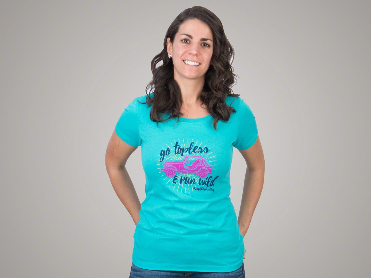 Go Topless and Run Wild. Rejoice in the return of warm weather by having your Jeep go topless on May 18th 2022. And what better way to show off your passion for Go Topless Day then by wearing this great looking teal blue short sleeve women's graphic T-Shirt. Featuring the side view of a Jeep in hot pink, this graphic Tee features the phrase Go Topless and Run Wild in a script design.
