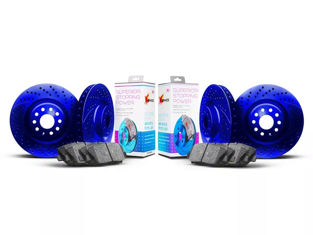 Construction and Appearance. Featuring G3000 grade high carbon cast iron rotors, this kit includes precision-drilled and slotted rotors with radial chamfered holes to improve cooling and reduce fade. The Kevlar ceramic brake pads offer quiet, low-dust performance, while the nano-coated, UV-resistant high gloss blue finish adds corrosion resistance and visual appeal.