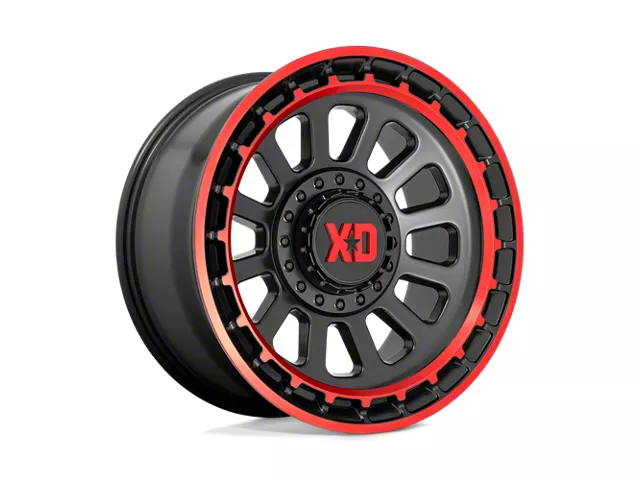 XD Omega Satin Black Machined Lip with Red Tint Wheel; 20x10 The XD Omega Satin Black Machined Lip with Red Tint Wheel combines a sleek, sophisticated design with premium construction that enhances the visual appeal and complements a wide range of vehicle styles. This wheel is perfect for those seeking to make a bold statement while maintaining elegance and robustness.
