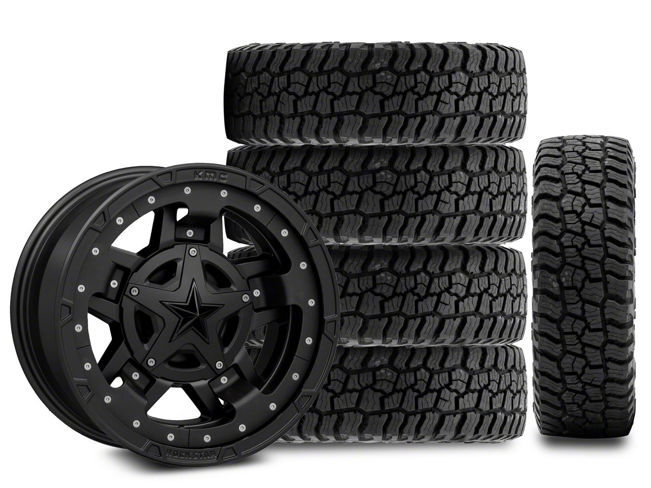 Mounted and Balanced Wheel and Tire Kit. This wheel and tire combo kit features (5) 17x9 XD Rockstar III Matte Black Wheels and (5) Mickey Thompson All-Terrain Baja Boss 35x12.50R17 tires that have been put together into an easy to buy kit that arrives to your door already mounted and balanced ready to be installed on your vehicle.