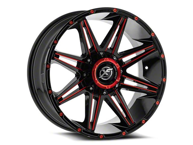 XF Offroad XF-220 Gloss Black and Red Milled 6-Lug Wheel; 22x10; -18mm Offset delivers a bold and modern aesthetic, ideal for enthusiasts seeking a refined yet assertive look for their vehicle. With its standout design and distinct finish, this wheel enhances the vehicle's visual stance and street presence. The precise craftsmanship and premium aluminum build reflect XF Offroad's dedication to quality and distinctive design. Whether parked or in motion, this wheel draws attention with its clean, aggressive styling.