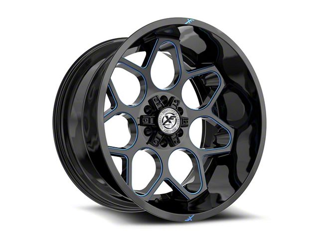 This 20x10 XF Offroad XF-233 Gloss Black and Blue Milled 6-Lug Wheel; 20x10; -24mm Offset is completed in a high-quality gloss black finish with blue accents to make your wheel the envy of everyone. For added looks and durability, the wheels has a durable clear coat that withstand the rigors of daily driving.