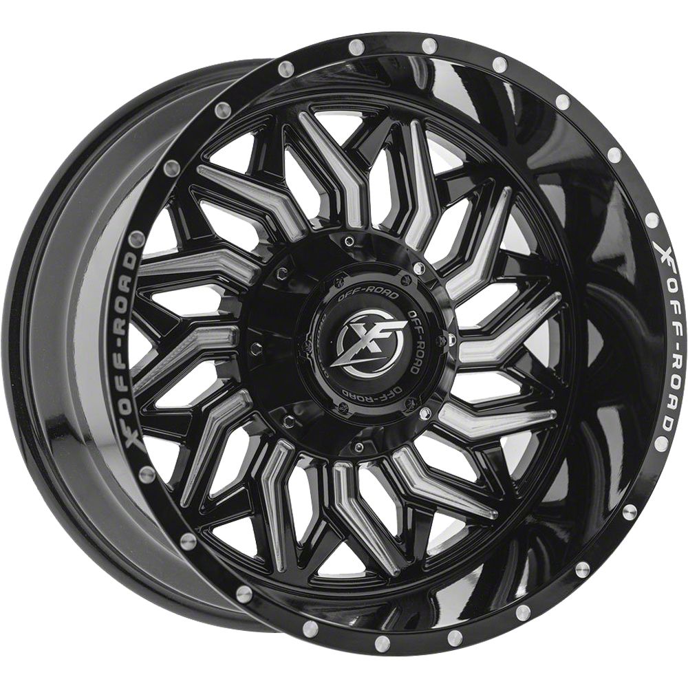 Gloss Black Finish with Milled Accents. This XF Off-road Wheel has a high quality, black finish that features milled accents for an impressive appearance. For added protection and good looks, this Wheel is completed in a durable, gloss clear coat that is tough enough to stand up against the hazards of everyday driving - including road chips and pitting.