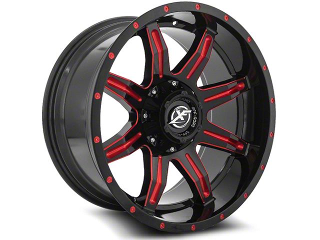 This 20x9 XF Offroad XF-215 Gloss Black and Red Milled Wheel; 20x9; 12mm Offset is completed in a high-quality gloss black finish with red accents to make your wheel the envy of everyone. For added looks and durability, the wheels has a durable clear coat that withstand the rigors of daily driving.