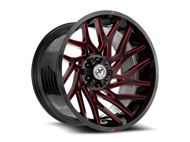 XF Offroad XF-229 Gloss Black and Red Milled Wheel; 24x12; -44mm Offset is a visually striking choice, offering a combination of rugged durability and modern styling. Its design complements off-road and sporty vehicles alike, enhancing the overall aesthetic appeal.