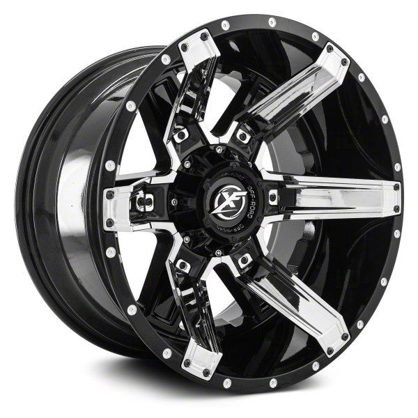 XF Offroad XF-214 Gloss Black with Chrome Inserts 5-Lug Wheel; 20x10; -24mm Offset exudes a sleek aesthetic appeal, complementing a range of vehicle styles. Its dark stainless finish emanates sophistication, while the brand reputation of XF Offroad ensures robustness. This wheel seamlessly merges elegance with durability.