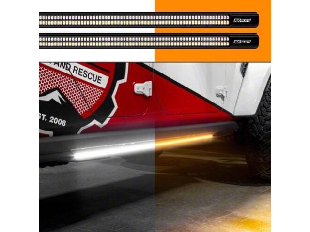 Premium Functional Design. The XK Glow 60-Inch White+Amber Running Board Step LED Light Bar with Turn Signals measures a generous 60 inches, providing ample coverage and enhanced visibility on the road. With the ability to illuminate both white and amber lighting, it offers versatility for various scenarios, whether it's illuminating your running boards or serving as a hazard warning. Stand out from the crowd with its intense alternating strobe lighting in hazard mode, ensuring maximum visibility during emergencies. Built with a durable IP67-rated construction, this light bar is resistant to dust, water, and other elements, ensuring reliable performance in all weather conditions.