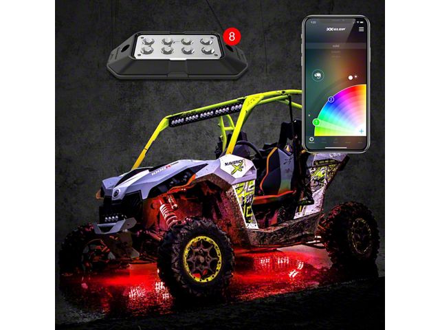 Advanced Lighting Control. The XK Glow App Controlled XKchrome Series Advanced RGB LED Rock Light Kits with Dual-mode Dash Mount Controller brings vibrant, customizable illumination to your vehicle. It allows you to sync lights with music or speed, offering an interactive and engaging experience while driving, making your ride stand out.