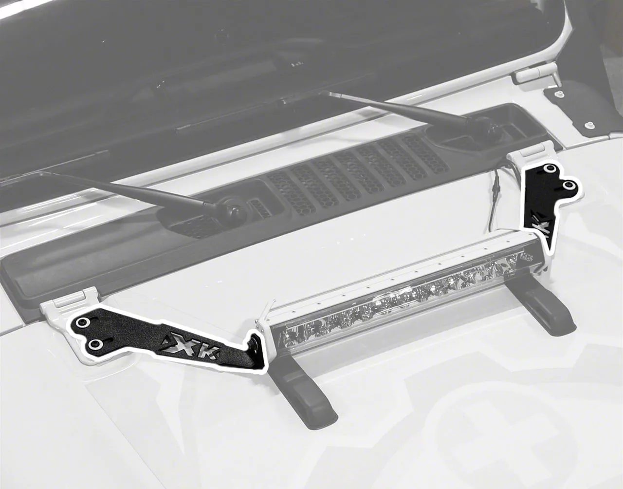 Application. The XK Glow 20-Inch Hood Light Bar Brackets fit 2018-2026 Jeep Wrangler Models, Excluding 4xe and Rubicon 392.