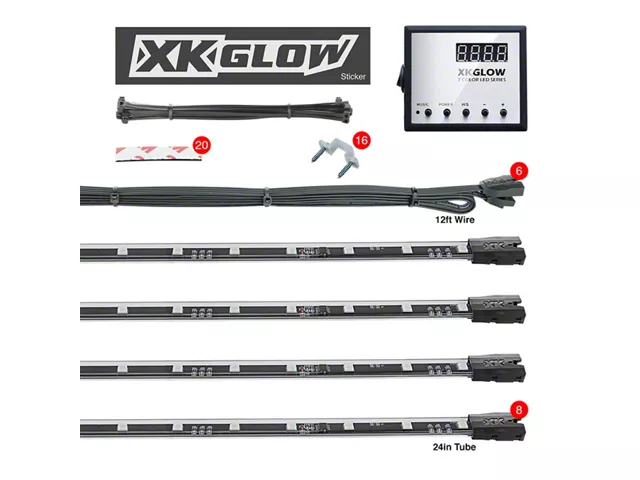 Construction and Appearance. Constructed with premium-grade materials, this LED Accent Light Kit is built to last, featuring a reinforced polycarbonate tube sealed with waterproof epoxy. Each tube measures 24 inches, designed to contour perfectly to the vehicle, delivering a bold and eye-catching glow while maintaining durability and resistance to the elements.