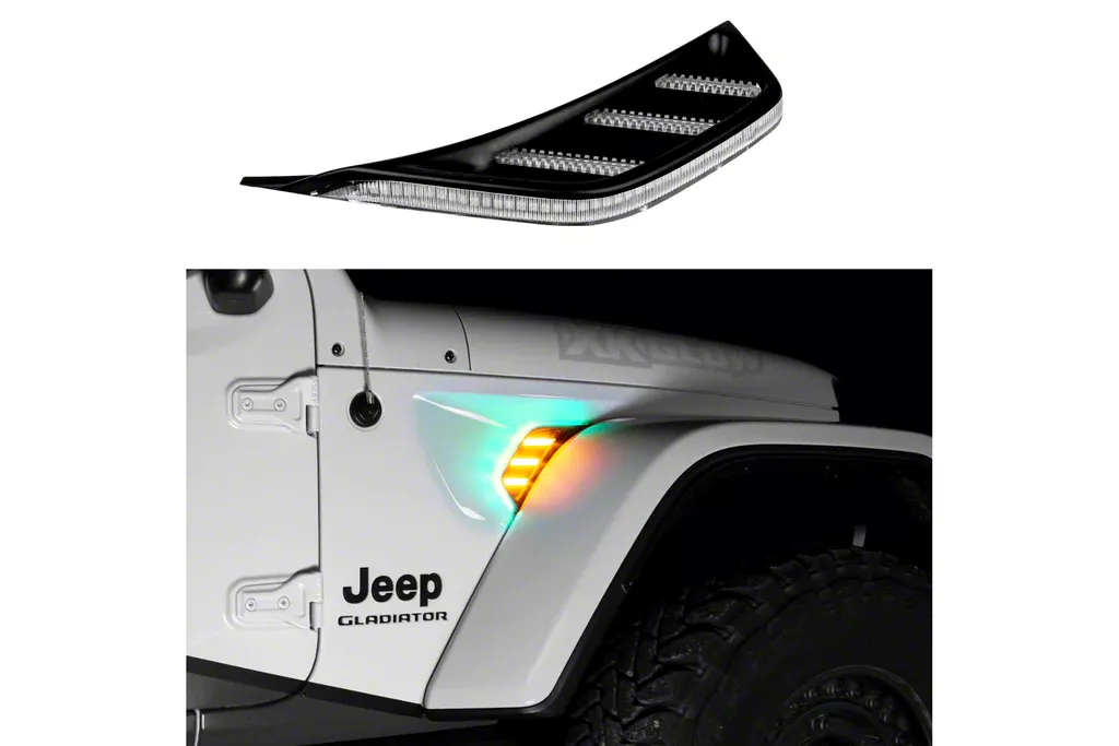 Application. The XK Glow RGB+Amber Fender Vent Turn Signal and Running Lights are engineered to accurately suit 2018-2026 Jeep Wrangler JLs.