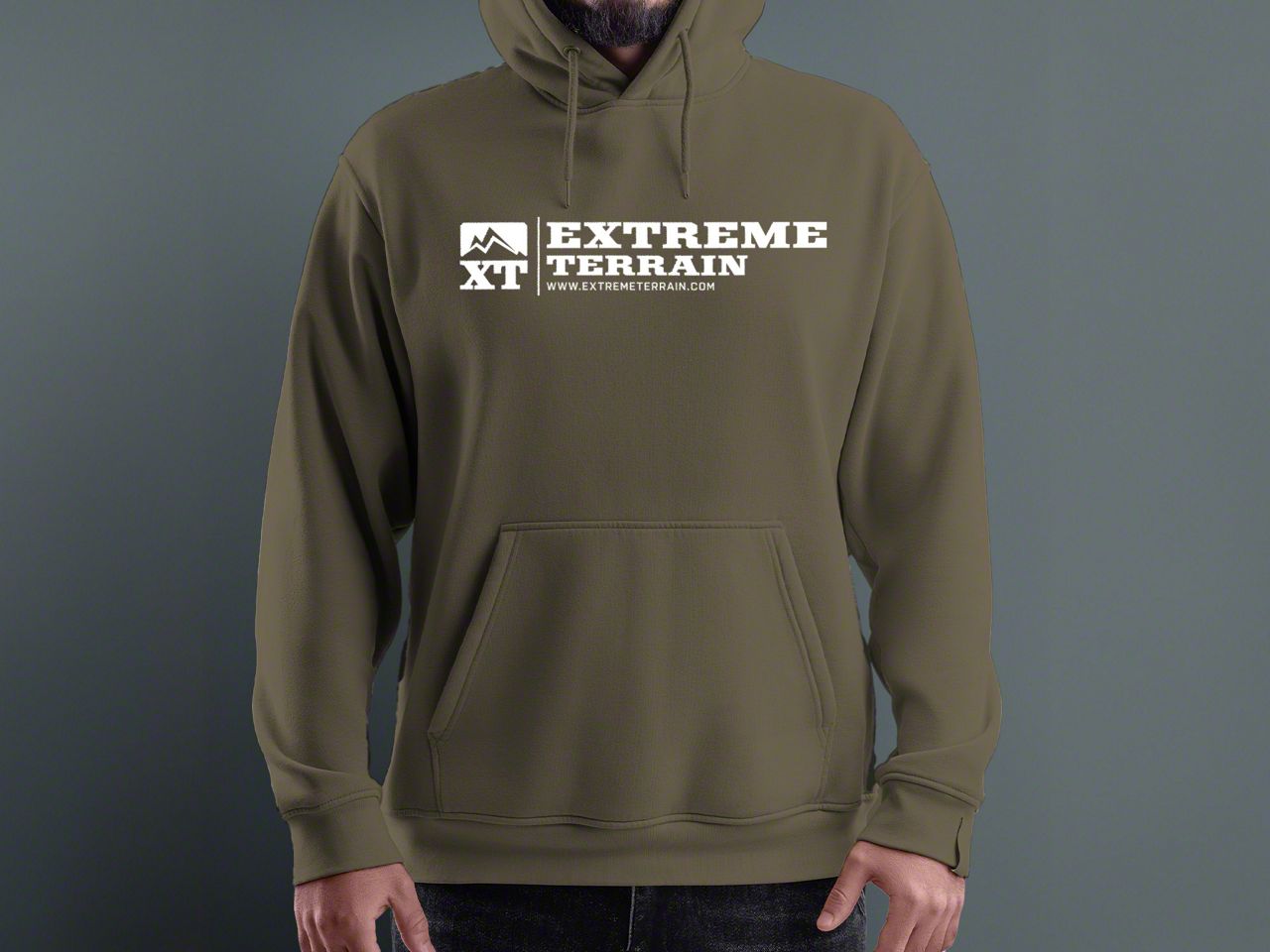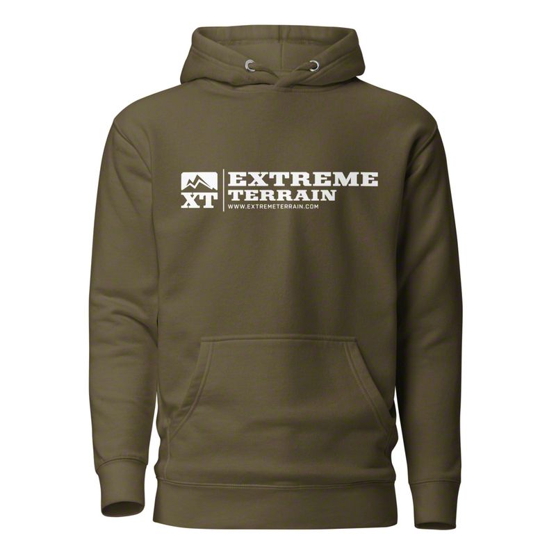 Stay warm while you wrench or ride in the XT Altitude Hoodie - Military Green, Classic unisex hoodie with a front pouch pocket and matching flat drawstrings.