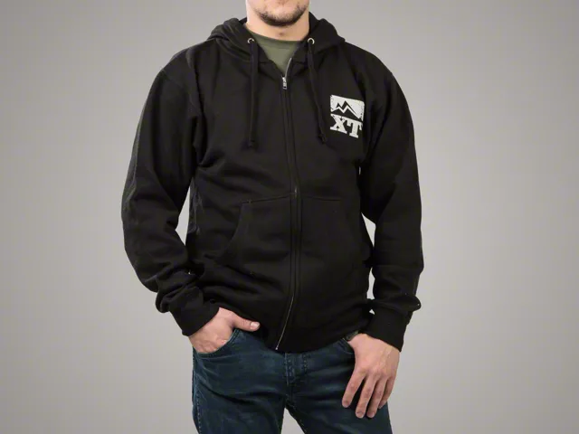 ExtremeTerrain Icon. Stay warm in style with the ExtremeTerrain Grunge Full Zip Hoodie. This black hoodie features an ExtremeTerrain Icon in white across the front and an ExtremeTerrain Logo in a grungy, tire tread styling on the back. The full zip up style with pockets makes this mid-weight XT hoodie perfect for trail runs, Jeep events or just hanging out with fellow Wrangler enthusiasts.