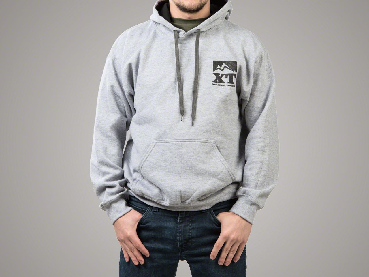 ExtremeTerrain Icon. Stay warm in style with the ExtremeTerrain Legacy Hoodie. This gray hoodie features an ExtremeTerrain Icon in black on the front and a classic ExtremeTerrain Logo in black across the back. Providing a nice complement in style, this hoodie features a contrasting black lining. The pull over style with a pouch makes this XT hoodie perfect for trail runs, Jeep events or just hanging out with fellow Wrangler enthusiasts.