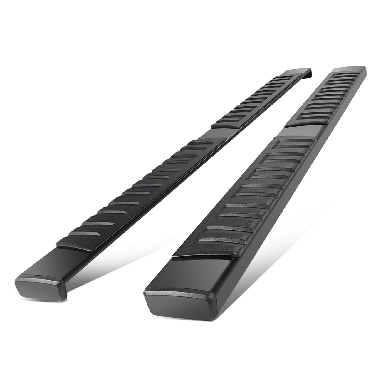 Construction and Appearance. Manufactured from durable aluminum, these running boards are designed for long-lasting rust resistance. They feature a sleek black powder-coat finish and raised textured step pads to improve traction and stability.