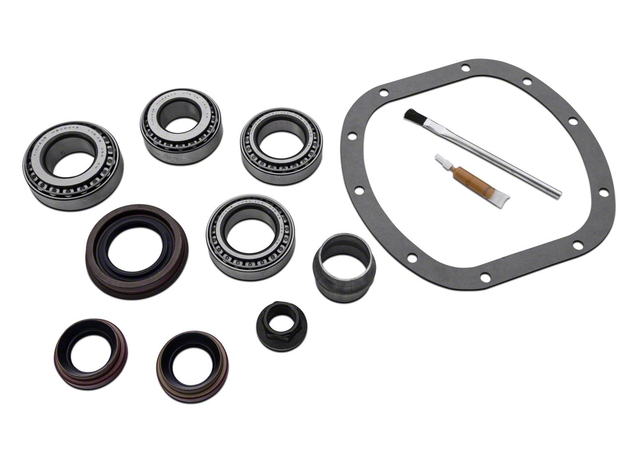 Construction. This kit includes everything you need to install your ring and pinion set, and all the small parts are incredibly high quality. You'll get bearings and races, plus seals, crush sleeve, oil baffles and slingers, marking compound, and a brush, as applicable.