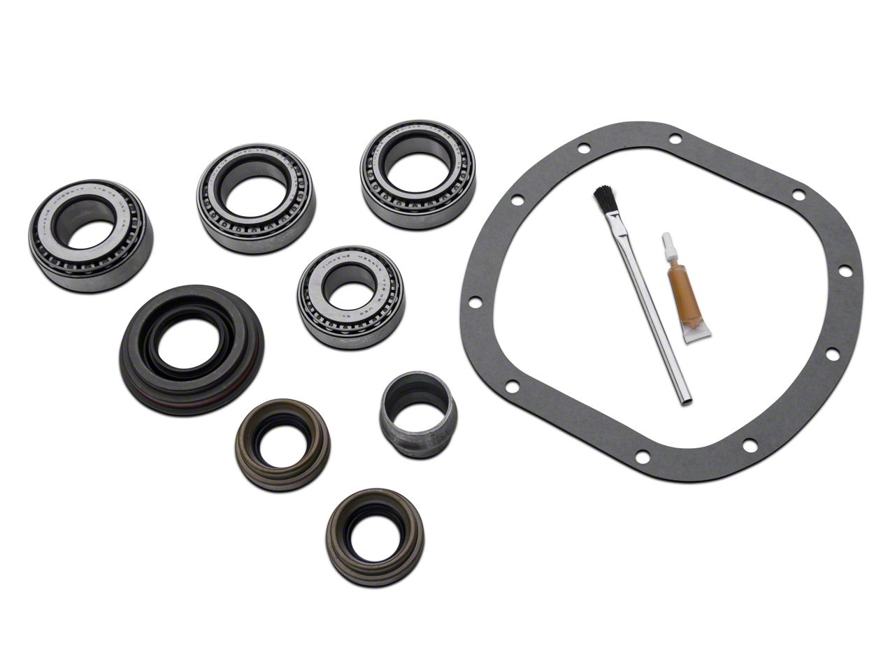 Construction. Every piece you need for installing your ring and pinion set will be found in this kit. The parts may be small but they're made with the highest quality. Your package will including bearings and races, crush sleeve, seals, oil baffles and slingers, a brush, and marking compound, as needed. The manufacturer covers this kit with a 1-year limited warranty.
