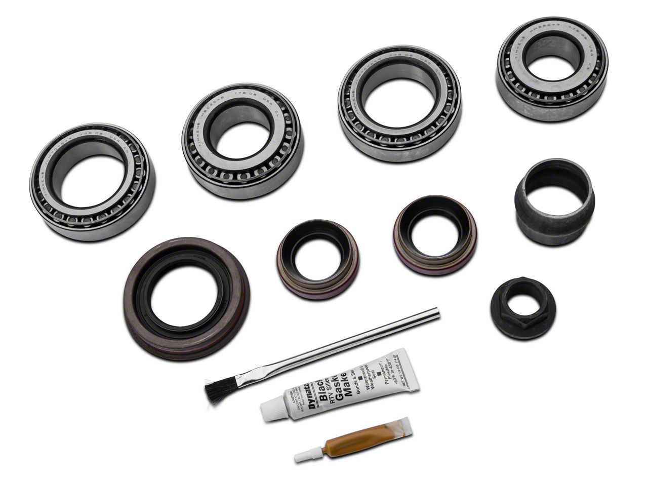 Construction. This kit includes everything you need to install a ring and pinion set: bearings and races, crush sleeve, oil baffles, slingers, brush, marking compound and seals - as applicable. The manufacturer has created this kit using high quality parts, and they guarantee it with a 1-year limited warranty.