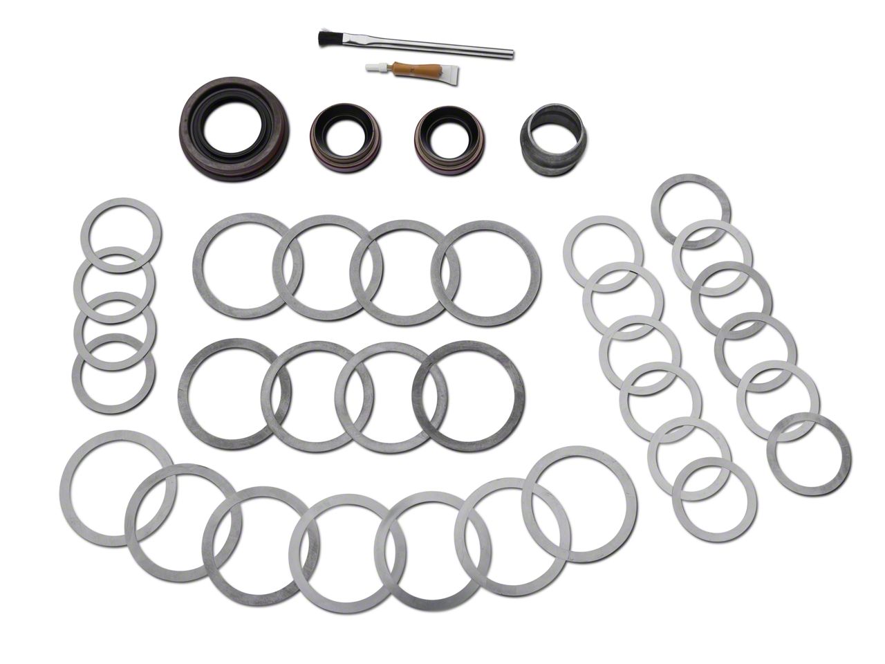 Gear Specs. Yukon Gear & Axle's Front Dana 44 minor install kit will provide your Rubicon JK with the ability to change its gears without the major expense. The kit includes pinion seal, crush sleeve, complete shim kit, and a brush with marking compound. This kit is used when changing ring & pinion gearing. What makes this a minor kit is the absence of bearings and races, on newer vehicles this change is completely unnecessary because the bearings should be in good condition but that varies between drivers, environments, maintenance and a whole load of other variables but the kit with the bearings is readily available.