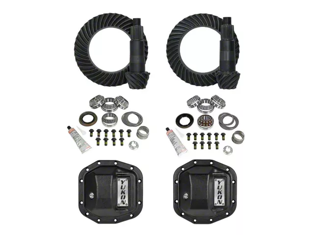 Construction and Appearance. Featuring a matte black and raw metal finish, the gears are crafted for strength and longevity under demanding conditions. The kit includes master overhaul installation kits for complete servicing and nodular iron Yukon Hardcore differential covers for added durability and protection.